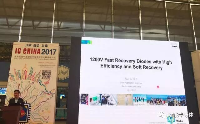 ▼ 瑞能首席应用工程师胡爱斌博士在IC China论坛中就瑞能新一代1200V 快恢复二极管性能参数以及和主要竞争对手参数对比进行了讲解,并介绍其主要的应用领域。演讲结束后,仍有不少观众前来向其讨教学习。